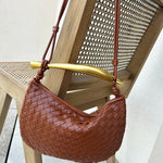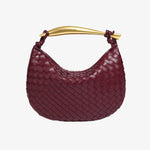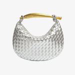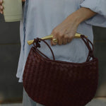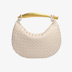 This woven crescent handle statement bag blends artisanal texture with modern sculptural design for a truly elevated accessory. Crafted with an intricate woven exterior and a soft crescent-shaped body, it delivers a refined yet relaxed silhouette that feels effortlessly luxurious. The standout curved handle adds a bold design element, creating a unique contrast that instantly draws attention while remaining elegant and wearable.