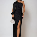 This elegant one shoulder evening gown is designed to make a confident, unforgettable impression at any formal occasion. Crafted with a sleek, body-skimming silhouette, this dress highlights natural curves while offering a refined balance between sophistication and modern glamour. The asymmetrical one-shoulder neckline adds a contemporary edge, drawing attention to the neckline and shoulders, while the fitted waist creates a flattering shape that elongates the figure.