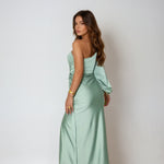The dramatic high slit enhances movement and adds a subtle touch of allure without compromising elegance, making it ideal for evening events where style and poise matter most. The smooth, flowing fabric drapes beautifully, allowing the dress to move effortlessly as you walk or dance. Perfect for formal dinners, weddings, galas, cocktail events, or special celebrations, this gown transitions seamlessly from elegant receptions to glamorous night settings.