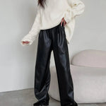 These high waist wide leg faux leather pants are designed to deliver a bold, modern silhouette with elevated sophistication. Featuring a structured high-rise waist, these pants define the waistline beautifully while creating a sleek, elongated look through the legs. The wide leg cut flows effortlessly from the hips, offering a flattering balance between structure and movement.